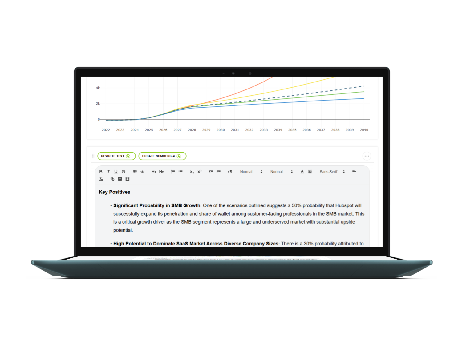 Our AI agents comb through your materials and model to surface critical facts, KPIs, and details to support the ‘gotta believe’ assumptions.
