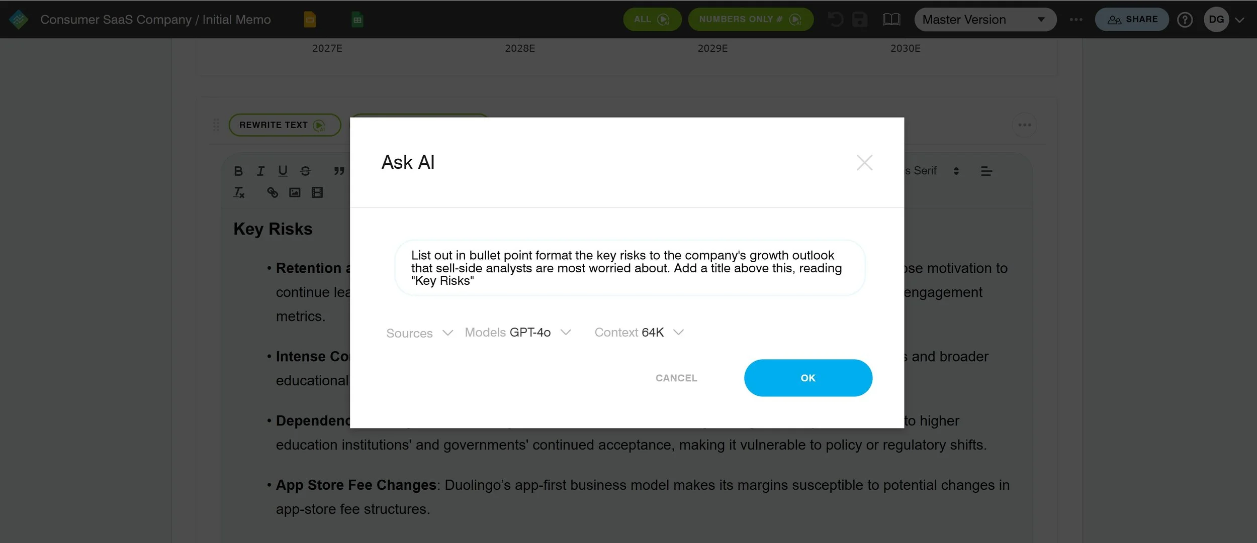 Use built-in editing tools to add memo sections, ask deeper questions for AI to answer, insert charts, tables and numbers, or refine the tone. Add nuance and judgment with your own hands on your own keyboard to make sure the conclusions reflect your own views.
